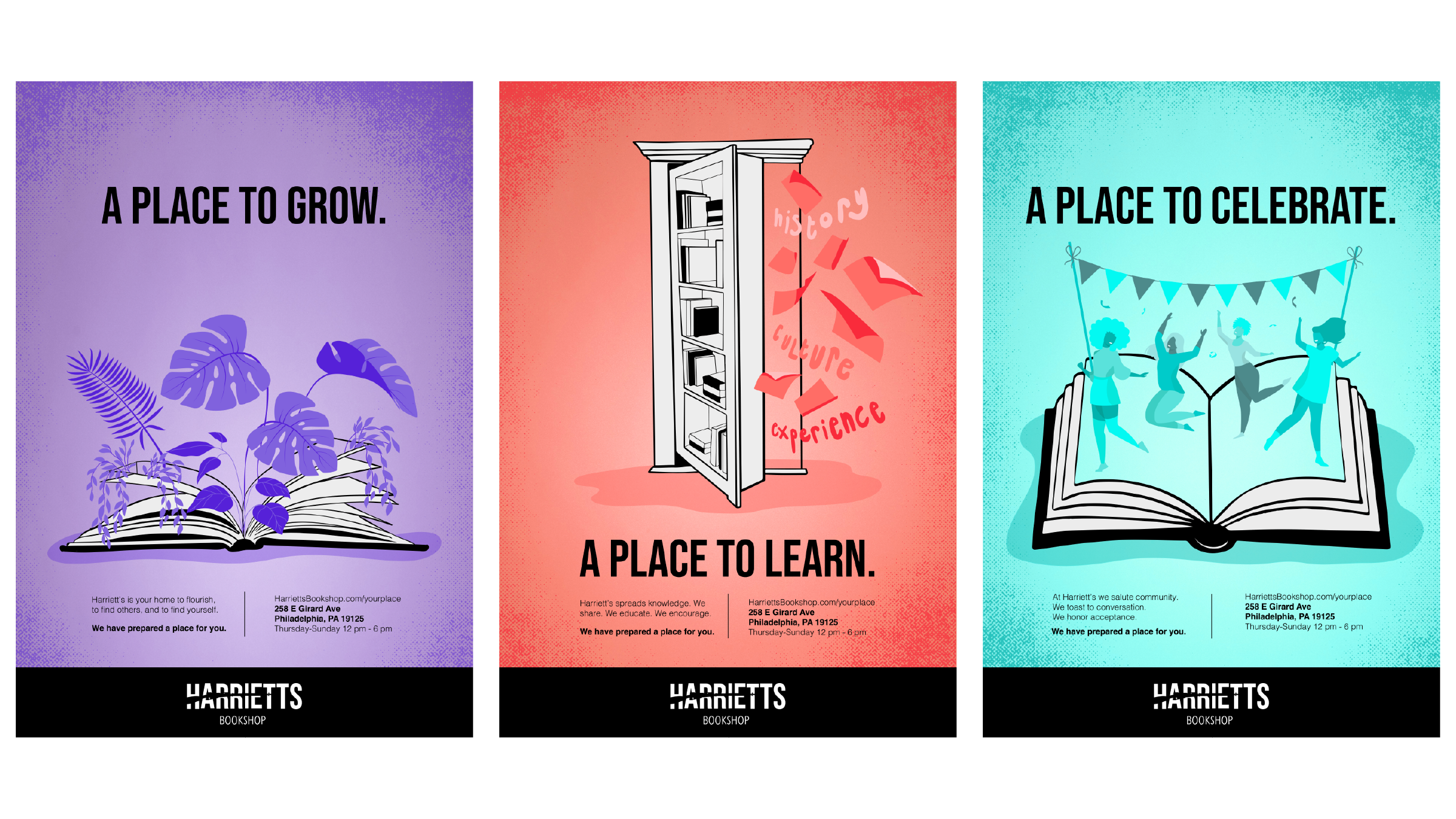 This campaign was produced for a real client out of Philadelphia. The concepts were pitched to Harriett’s Bookshop after the semester-long process.