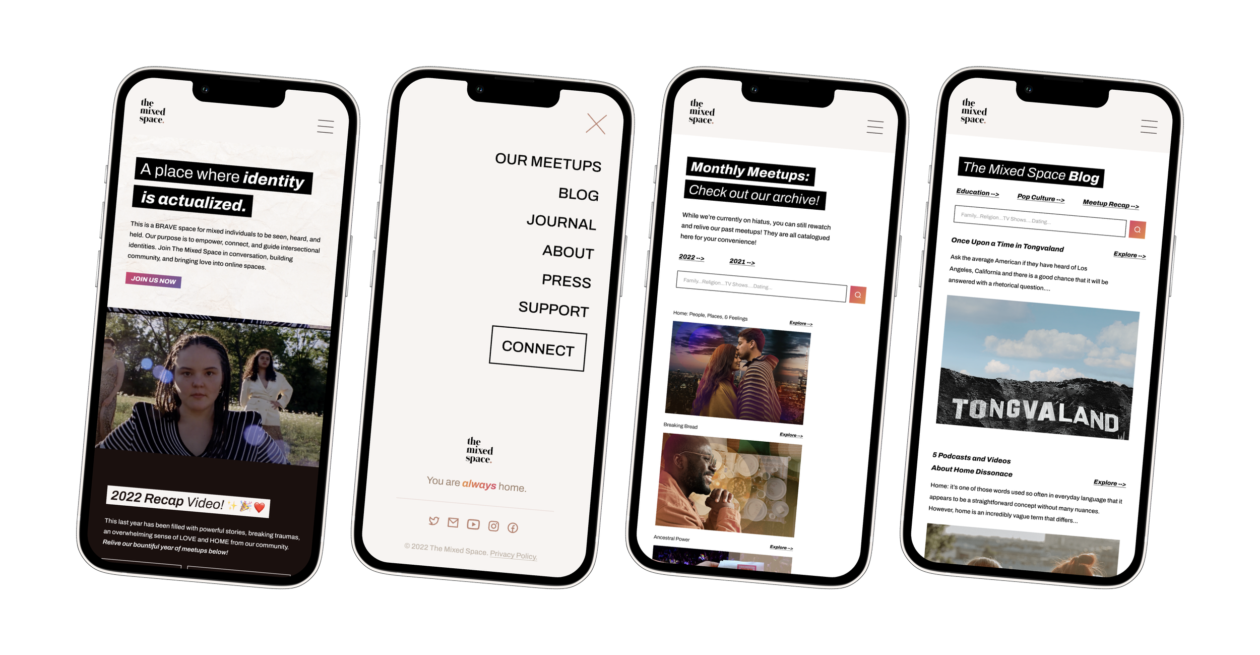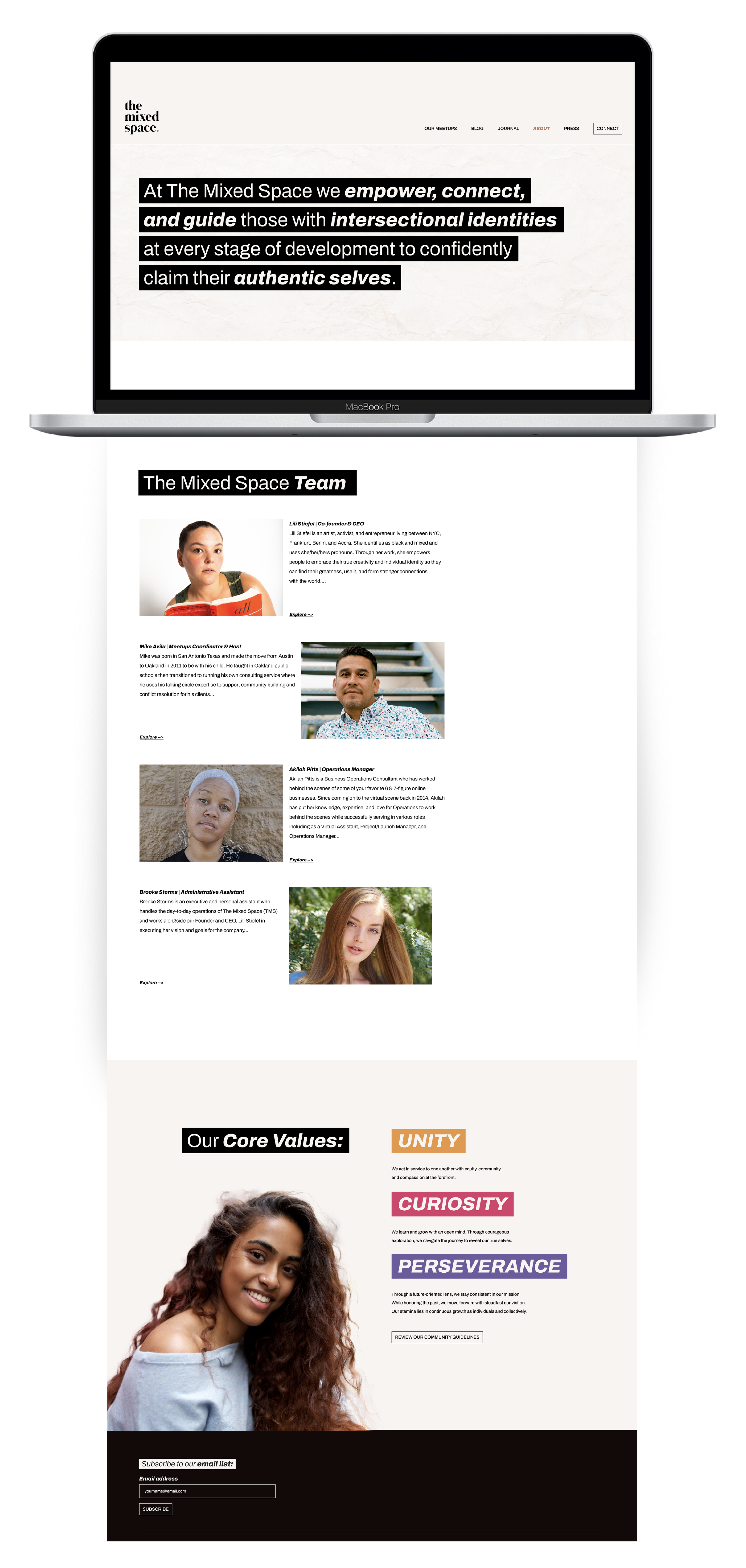 The Mixed Space is a virtual community of mixed, intersectional, and in between identities. We worked with The Mixed Space team every step of the way to carve out the brand’s mission, vision, and other personality aspects. The brand design went through a refresh as well— primarily modernizing the typography approach and establishing a stronger imagery style. This brand is sensitive in nature, but bold in unfettered belief, acceptance, and belonging.